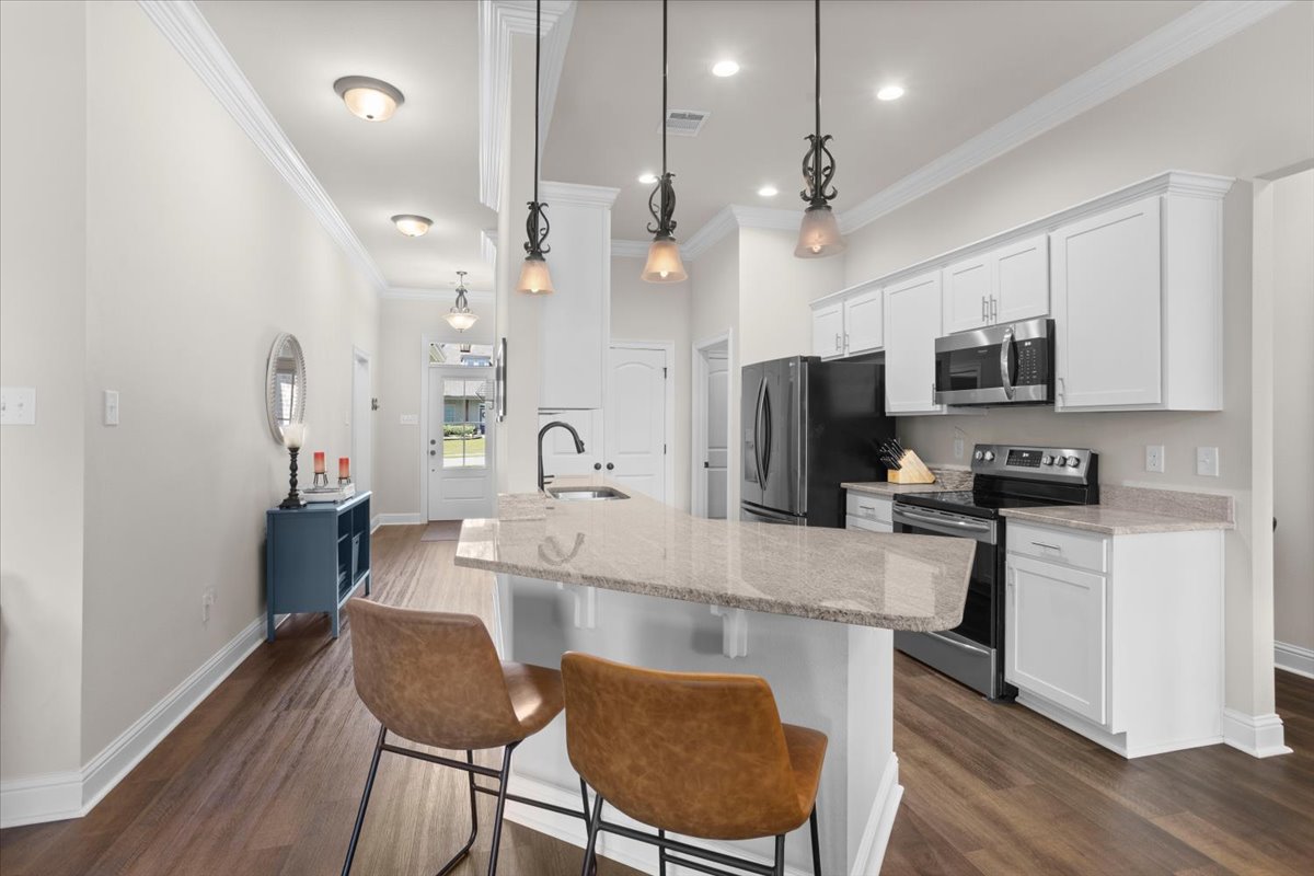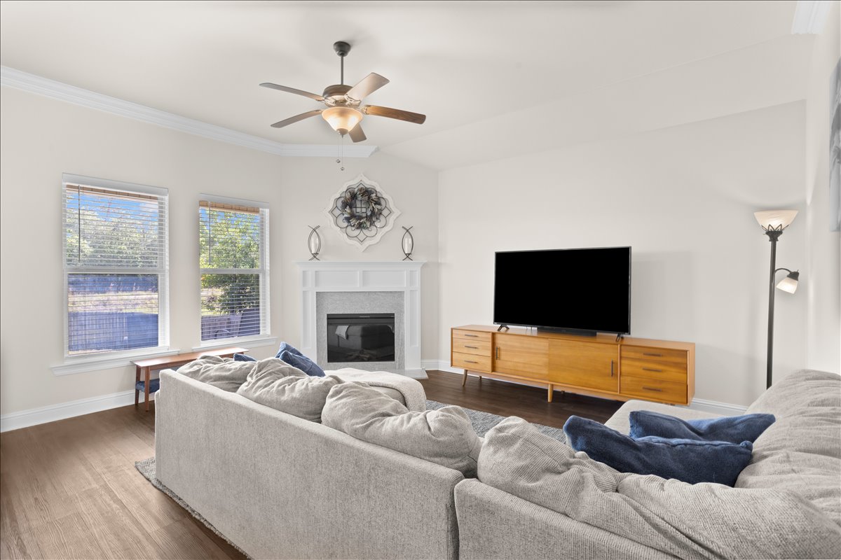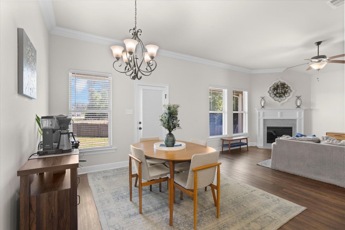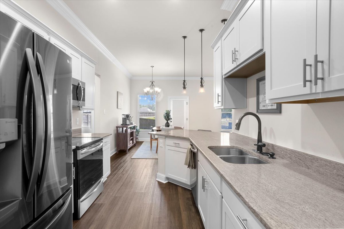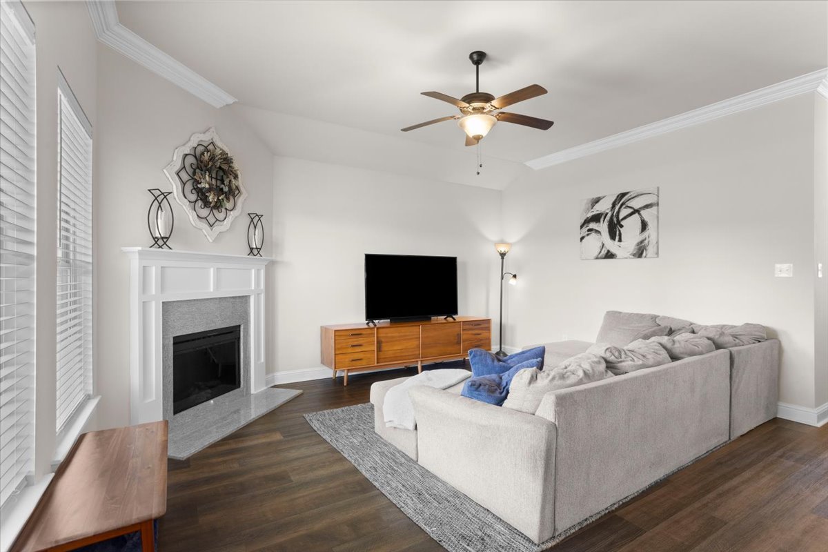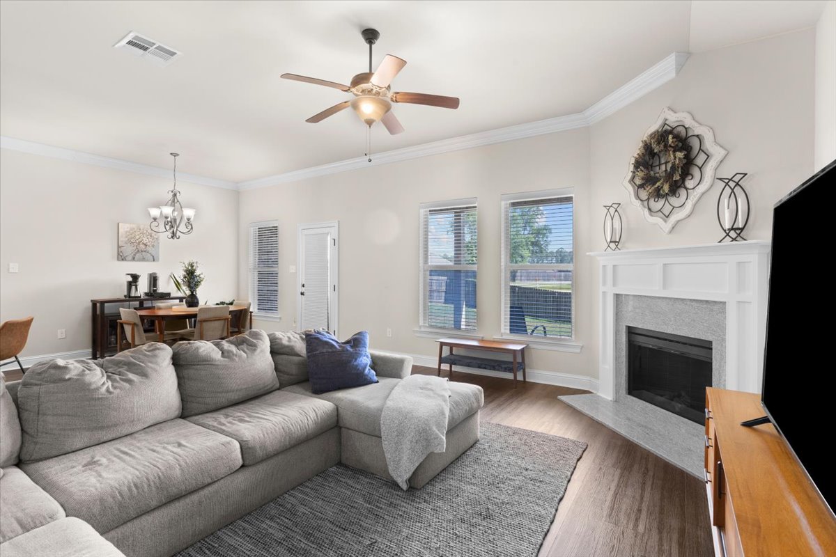 The layout is open but smart. Split bedrooms mean the primary suite has real separation from the rest of the house. Inside that suite you get a double vanity, soaking tub, separate shower, private water closet, and a walk-in closet. The main living areas have luxury vinyl plank flooring, crown molding, recessed lighting, and a fireplace with a granite profile. The kitchen has granite counters, stainless steel appliances, pendant lighting, and an undermount sink.