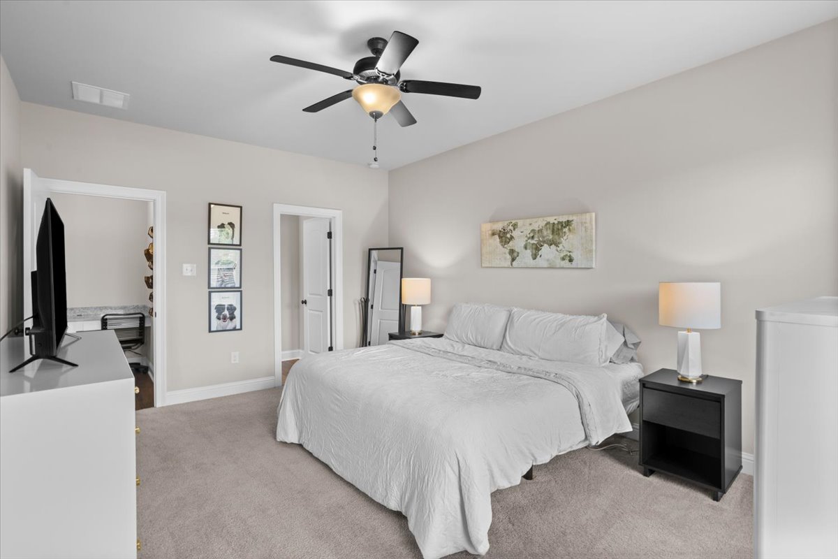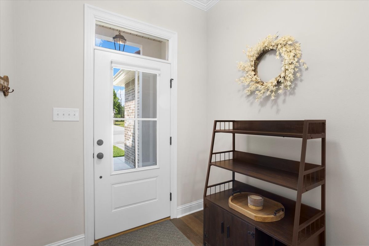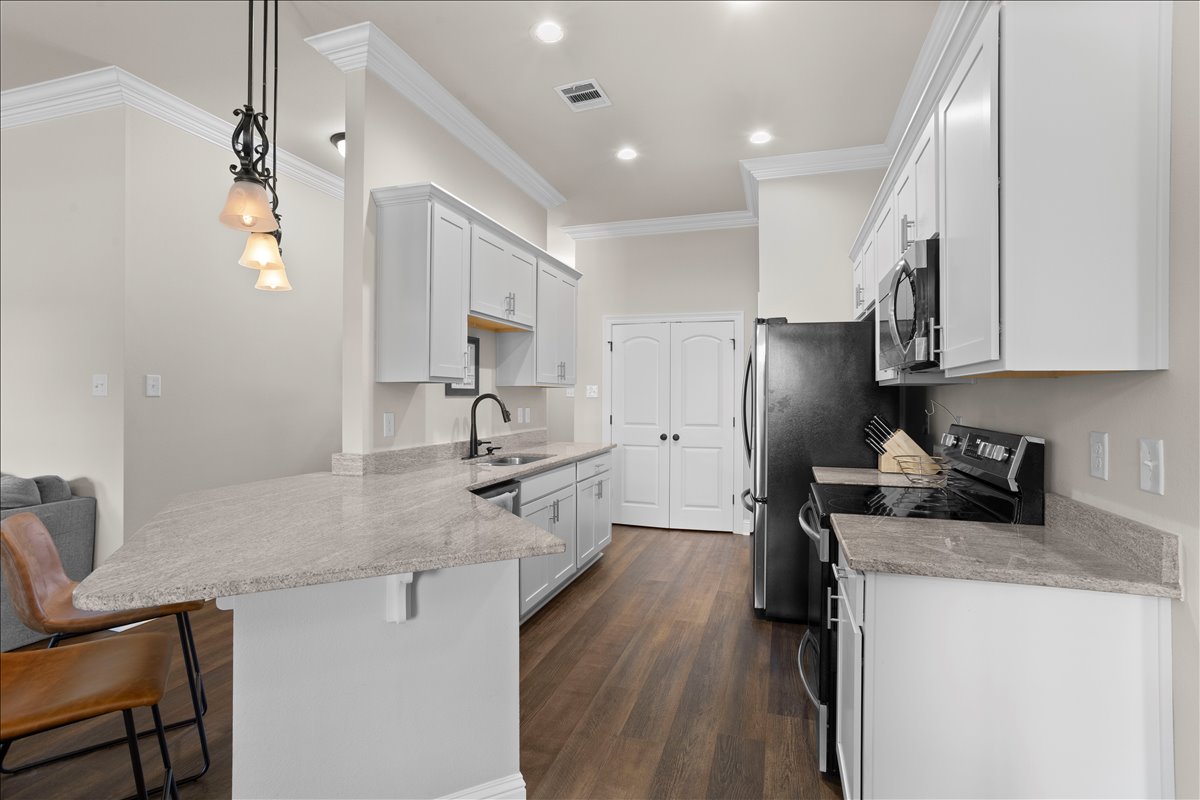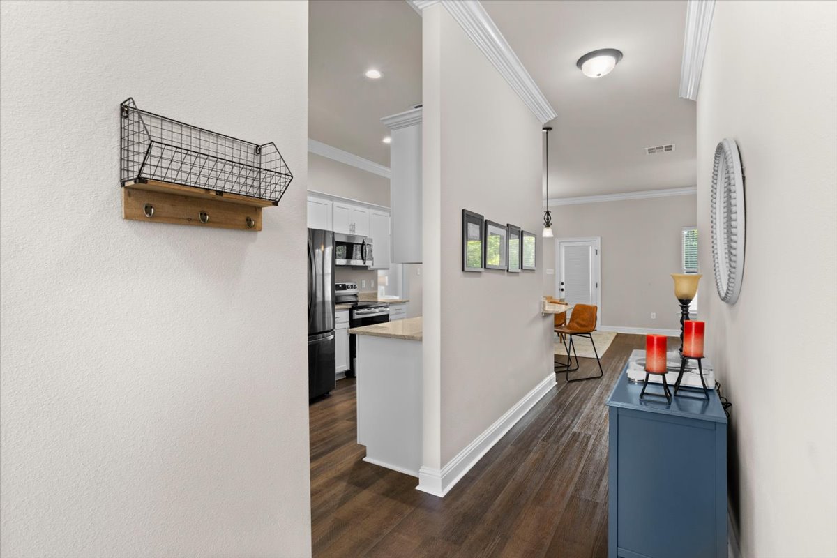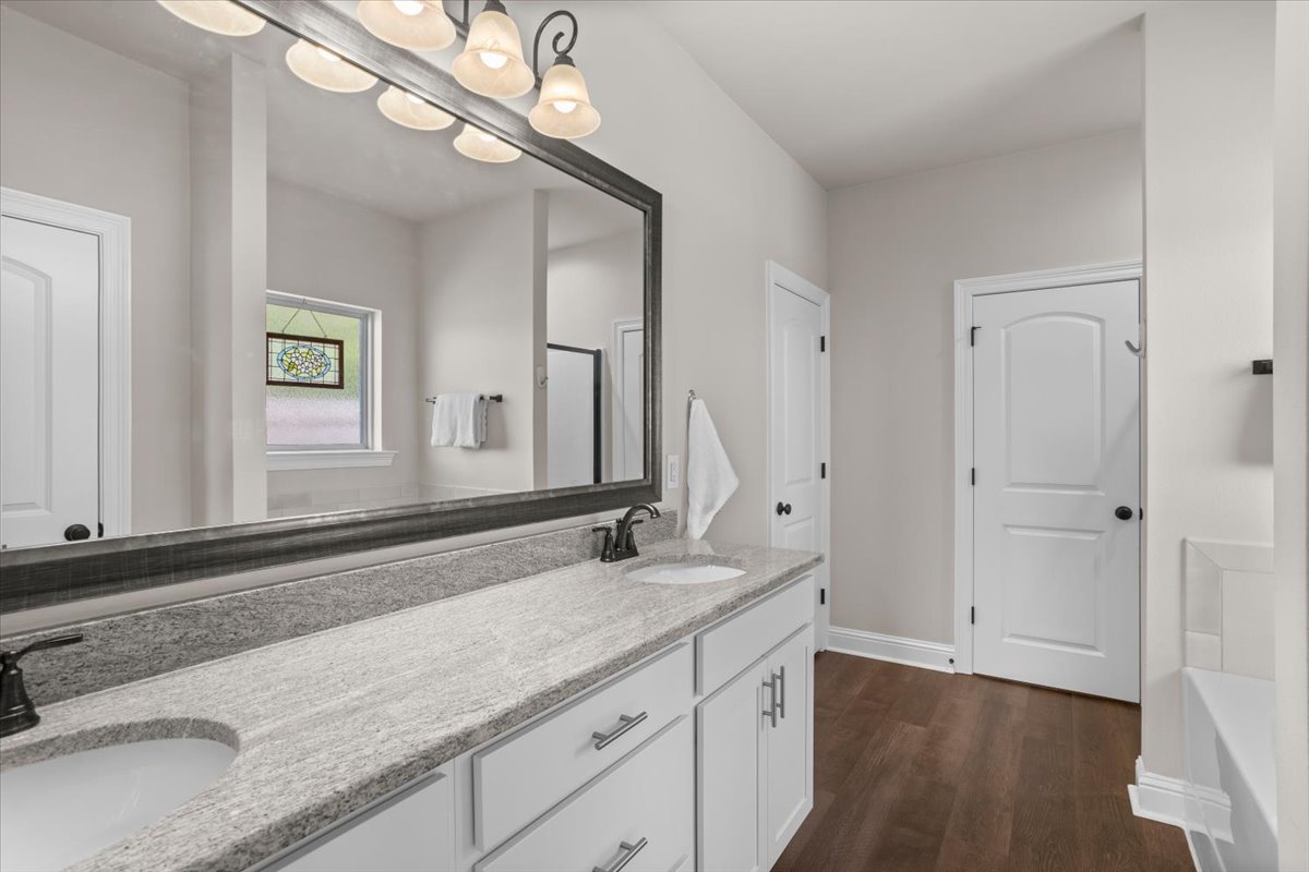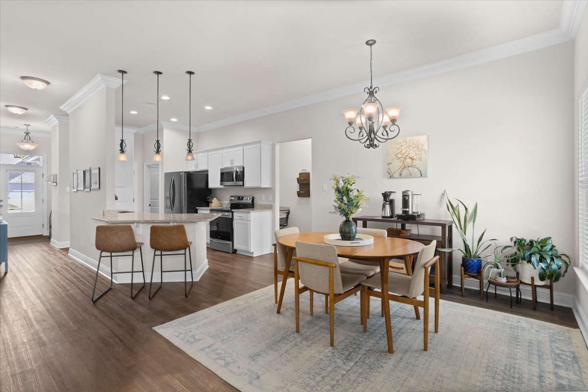 The layout is open but smart. Split bedrooms mean the primary suite has real separation from the rest of the house. Inside that suite you get a double vanity, soaking tub, separate shower, private water closet, and a walk-in closet. The main living areas have luxury vinyl plank flooring, crown molding, recessed lighting, and a fireplace with a granite profile. The kitchen has granite counters, stainless steel appliances, pendant lighting, and an undermount sink.