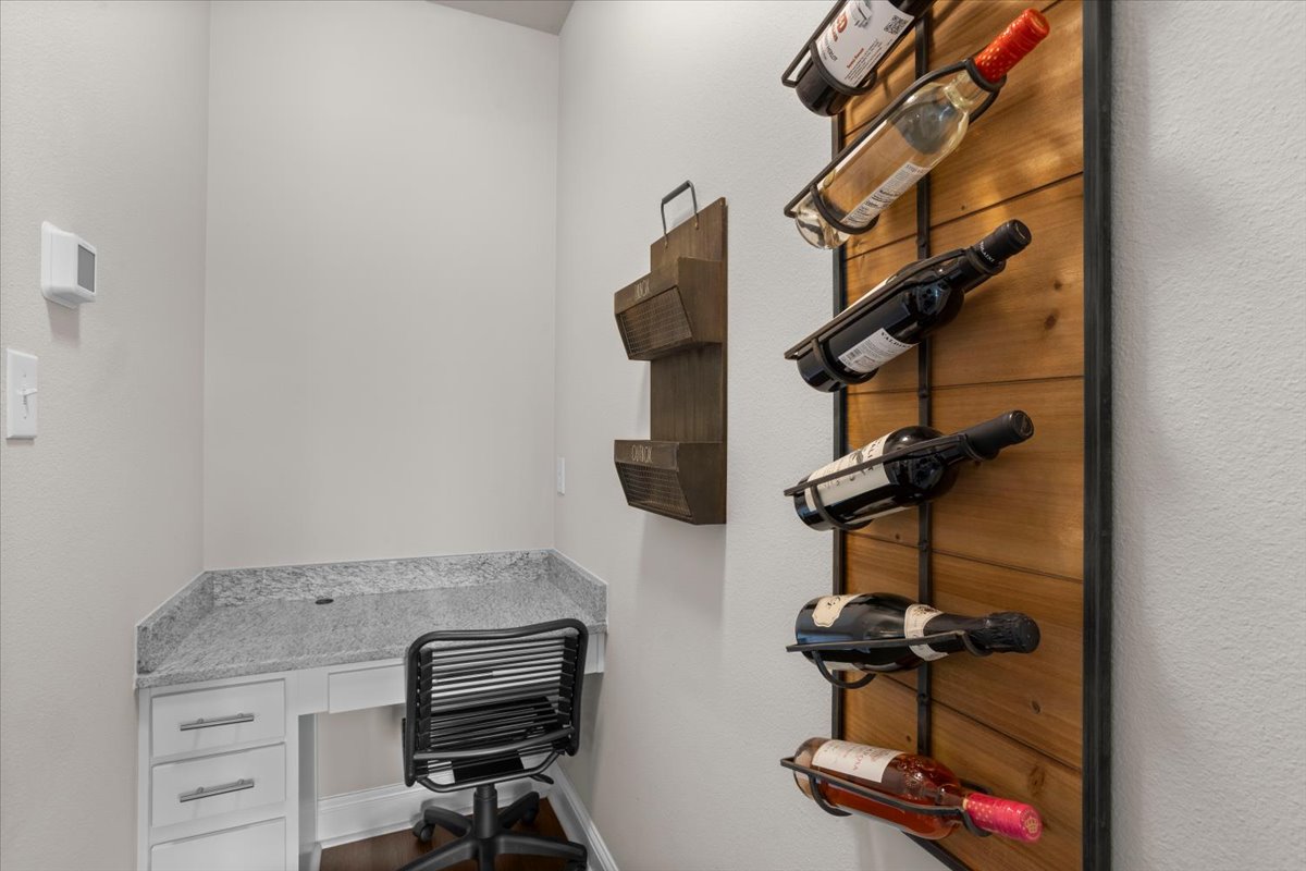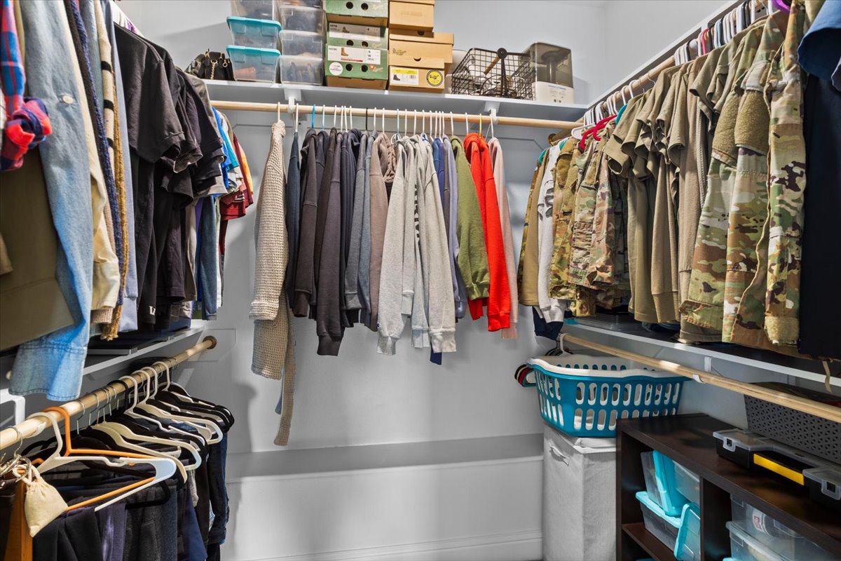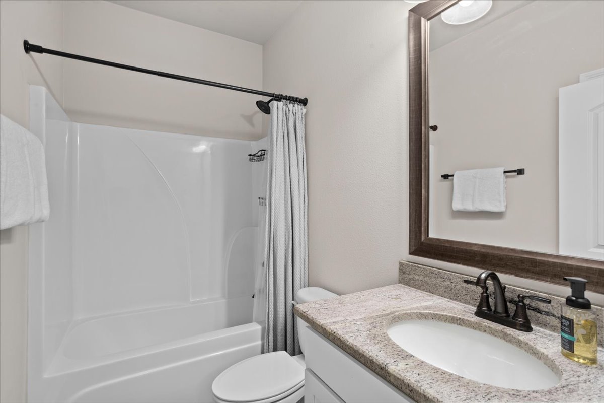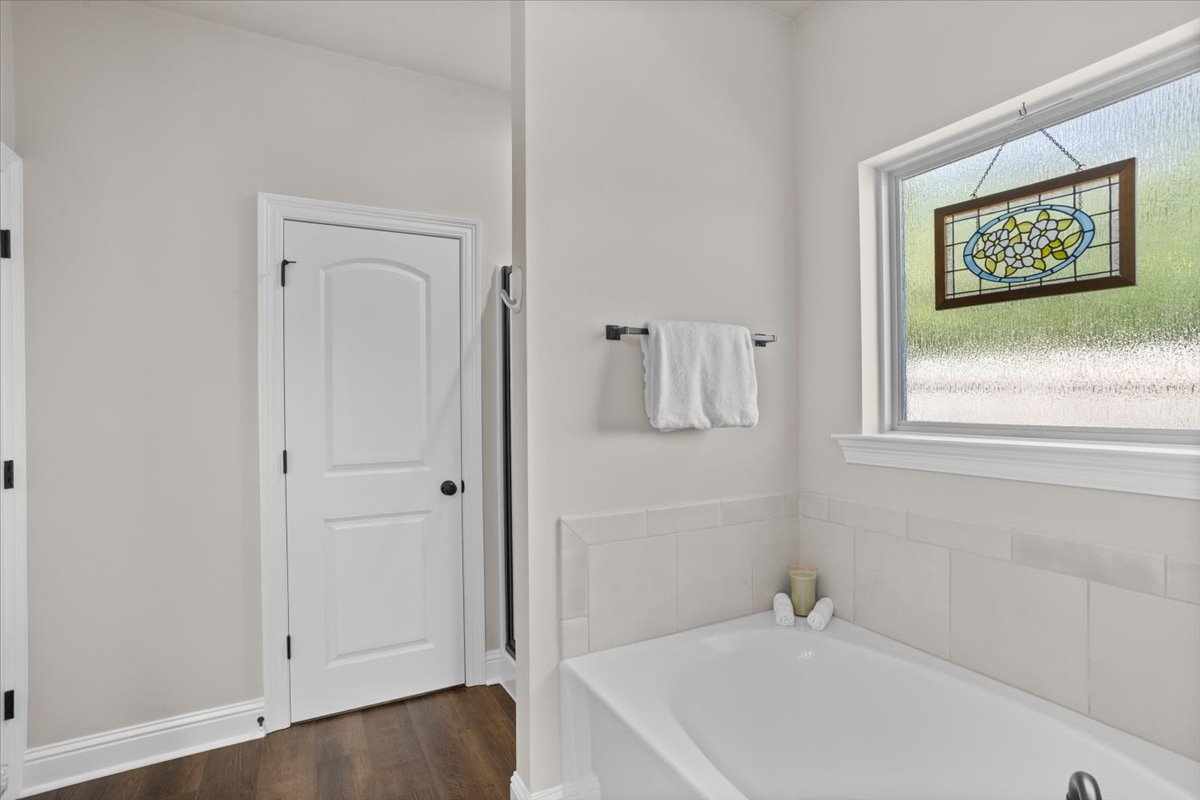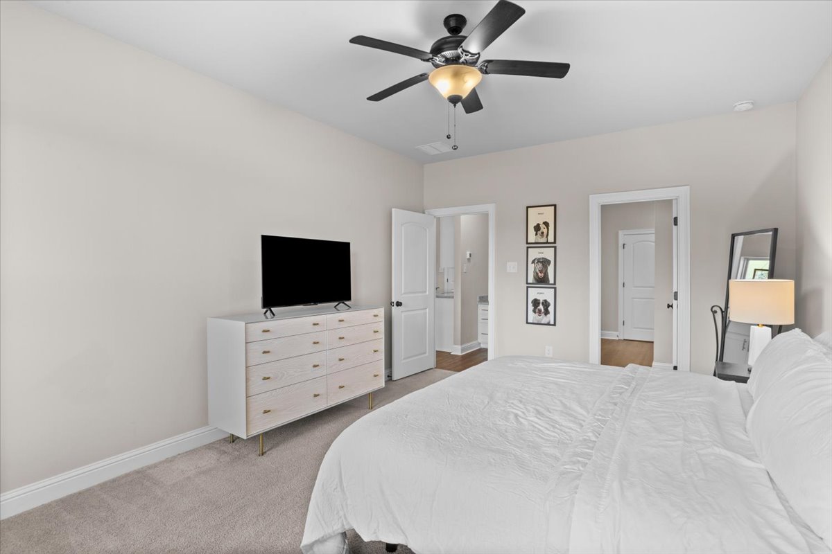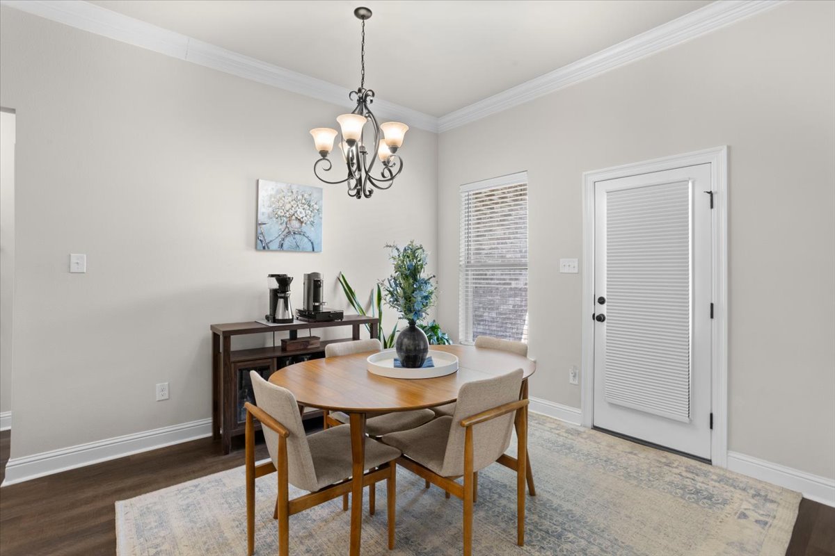 The layout is open but smart. Split bedrooms mean the primary suite has real separation from the rest of the house. Inside that suite you get a double vanity, soaking tub, separate shower, private water closet, and a walk-in closet. The main living areas have luxury vinyl plank flooring, crown molding, recessed lighting, and a fireplace with a granite profile. The kitchen has granite counters, stainless steel appliances, pendant lighting, and an undermount sink.
