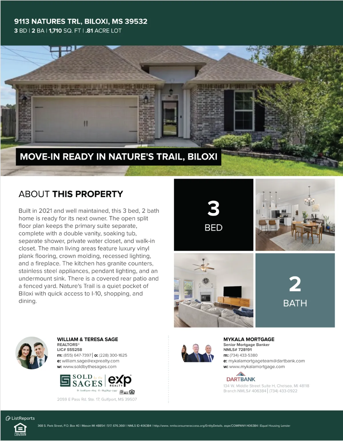 There is a covered rear patio and a fenced yard. The lot gives you room to breathe. Nature's Trail is a quiet pocket of Biloxi with quick access to I-10, shopping, dining, and Keesler AFB.